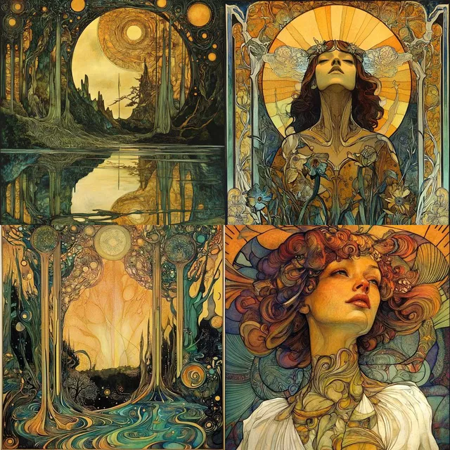 Стиль «Возрождение ар-нуво» очаровывает своими замысловатыми узорами и плавающими органическими формами, напоминающими стиль югендстиль начала XX века. Он прекрасно передаёт темы природы и фэнтези с помощью тёплых, землистых тонов и золотистых оттенков, создавая сказочную, эфемерную атмосферу.