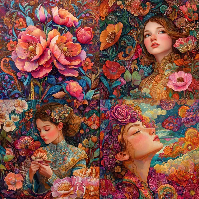 Этот стиль отличается яркостью и замысловатостью. Он мастерски сочетает в себе элементы модерна и современного фэнтези, создавая насыщенную палитру красок и деталей. Композиции изобилуют декоративными узорами и растительными мотивами, что создаёт атмосферу сказочности и сюрреализма.