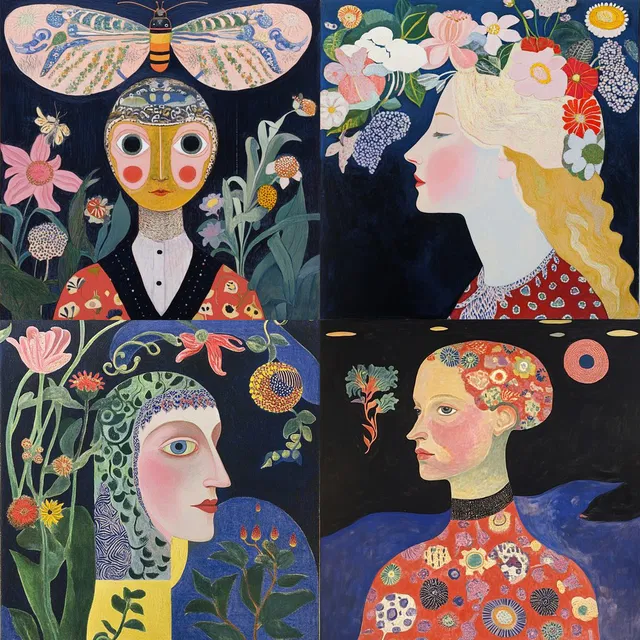 Этот яркий и причудливый стиль объединяет в себе влияние ар-нуво и игривый сюрреализм, создавая сложные композиции, наполненные насыщенными цветами и органическими формами. Декоративные элементы и орнаментальные узоры занимают доминирующее положение, придавая образам сказочное качество, в котором природа и воображение гармонично сочетаются.