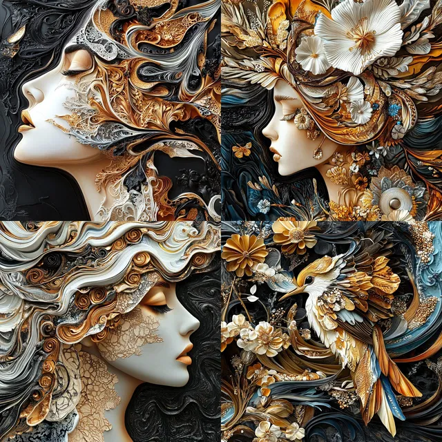 Этот стиль отличается пышностью и замысловатостью. Он изобилует завитками узоров и многослойными текстурами, напоминая о величии стилей ар-нуво и барокко. Доминируют золотые акценты и металлический блеск, создавая роскошный визуальный гобелен, одновременно динамичный и фактурный. Изогнутые линии и органические формы придают скульптурность, а насыщенная цветовая палитра усиливает ощущение драматизма и элегантности.