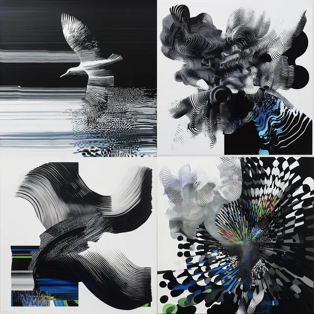 Этот стиль отличается яркой геометрической абстракцией с особым вниманием к оптическим иллюзиям и визуальным эффектам. Преобладают монохромные палитры, которые создают сильный контраст и подчёркивают сложные узоры и многослойные композиции.