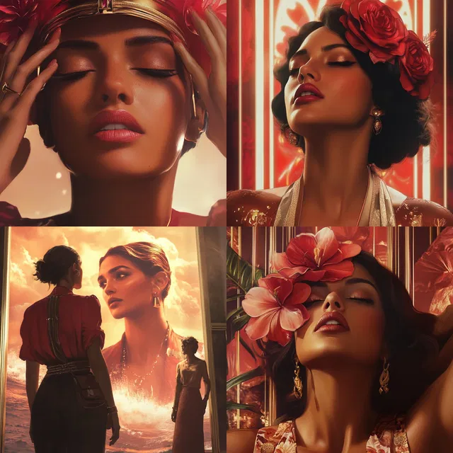 Роскошное кинематографическое изящество очаровывает своим пышным реализмом и яркими изображениями. Для стиля характерны драматическое освещение и насыщенные текстуры. Он во многом опирается на богато украшенные детали и смелые композиции, напоминающие влияние ар-деко и ренессанса. Здесь доминируют элегантные фигуры и величественная архитектура, расположенная на фоне роскошных интерьеров. Тёплые оттенки и глубокие тени создают романтическое и страстное очарование, подходящее для моды, редакционных статей и кинематографа. Однако из-за сосредоточенности стиля на величии его применение в минималистичном или абстрактном контексте может быть ограничено.