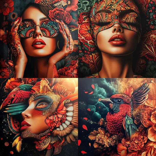 Этот яркий и замысловатый стиль представляет собой богатую палитру цветов и текстур, сочетая элементы стилей ар-нуво и барокко. Детальный и выразительный, он отлично подходит для создания динамичных композиций, одновременно витиеватых и сложных.