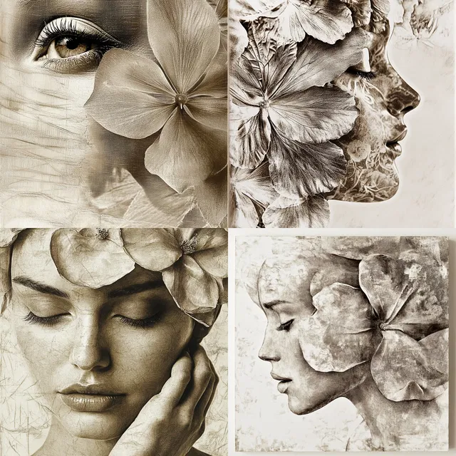 Текстурное богатство и органические формы преобладают, создавая многослойную глубину и вызывая ощущение вневременной элегантности. Использование тонов сепии и винтажных текстур рождает ностальгическое тепло, а плавные композиции и деликатные переходы оттенков наделяют каждый элемент неким эфемерным качеством.