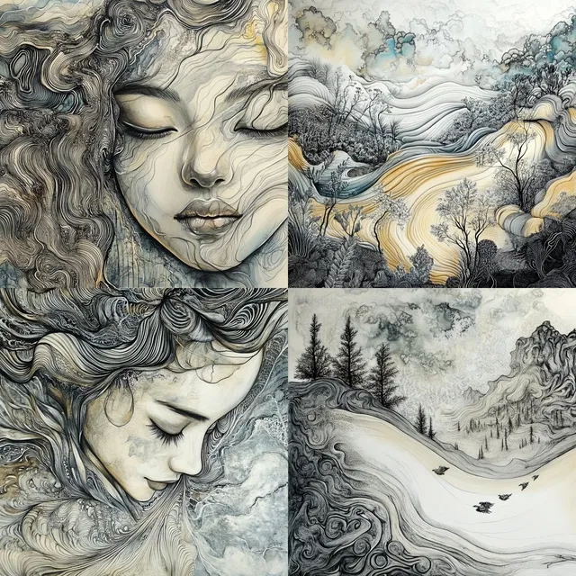 Этот стиль завораживает своими органическими формами и фактурными поверхностями, напоминающими модерн и сюрреализм. Изогнутые линии и приглушённые тона создают безмятежную мистическую атмосферу. Замысловатые детали и плавные мотивы вызывают ощущение органической абстракции.