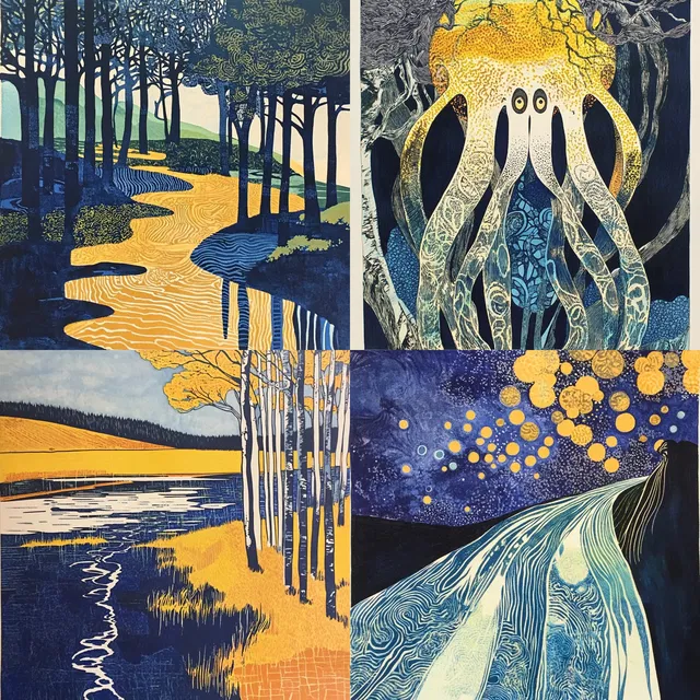 Яркие цветовые контрасты и замысловатая прорисовка линий определяют этот стиль, напоминая об элегантности ар-нуво с современными нотками. Органичные формы и детальные текстуры создают насыщенную визуальную композицию, а сочетание синих и жёлтых оттенков добавляет динамичности.