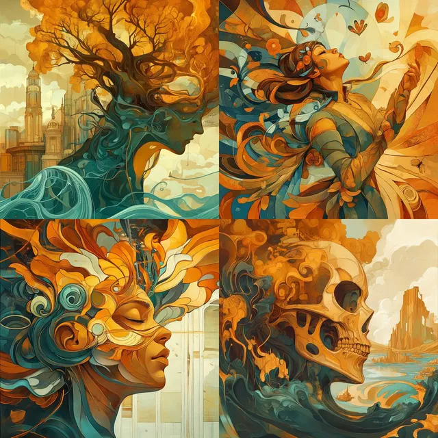 Стиль вдохновлён искусством модерна и сочетает его с модернистскими влияниями в ярких композициях. Насыщенные цвета и динамичность создают сказочную атмосферу, а темы гармонии и трансформации раскрываются через природные мотивы и человеческие фигуры.