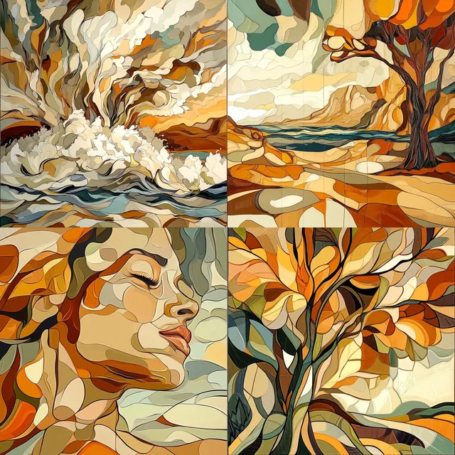 Органическая абстракция занимает доминирующее положение: плавные композиции и многослойные текстуры создают динамичное визуальное впечатление. Тёплые земляные тона и золотистые оттенки вызывают чувство гармонии и спокойствия, напоминая эстетику ар-нуво и витражей.