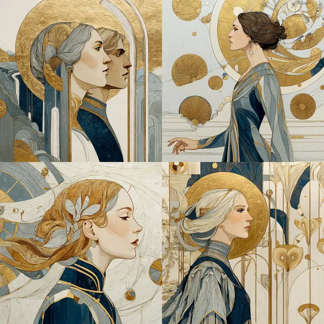 Золотые акценты и приглушённая палитра создают атмосферу роскоши и спокойствия. Изящные линии и плавные формы вызывают ощущение исторического величия.