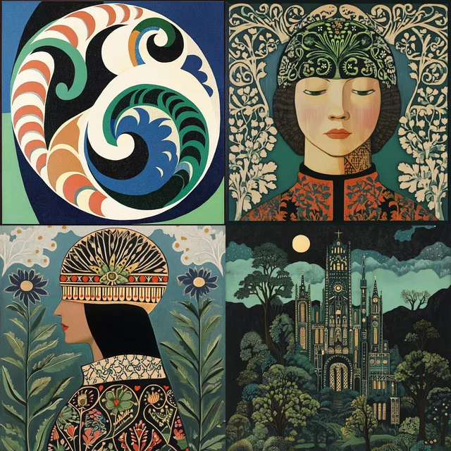 Этот стиль отличается богатством орнаментов и фактур. В нём ярко прослеживаются влияния ар-нуво и народных художественных традиций. В каждой композиции переплетаются замысловатые узоры и декоративные мотивы.