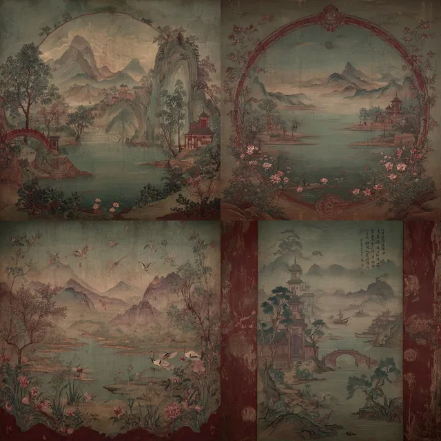 Приглушённая цветовая палитра с преобладанием мягких пастельных и земляных тонов создаёт безмятежную и спокойную атмосферу, подчёркивая изображённые культурные и исторические сюжеты. Стиль прекрасно передаёт суть традиционных пейзажей и культурных мотивов, предлагая уникальное сочетание наследия и артистизма.