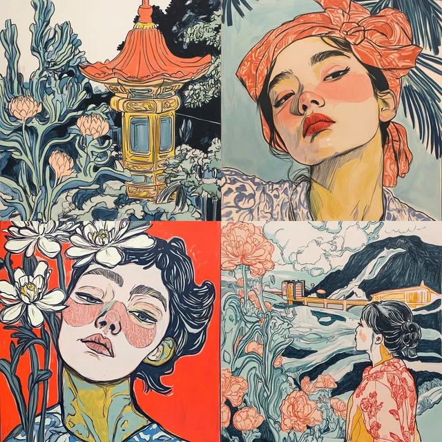 Выразительные линии и детальная иллюстрация определяют этот стиль, в котором заметно влияние ар-нуво и восточного искусства. Мягкие пастельные тона и приглушённые оттенки создают гармоничную и сказочную атмосферу, а сложные детали и культурные мотивы добавляют глубину и насыщенность.