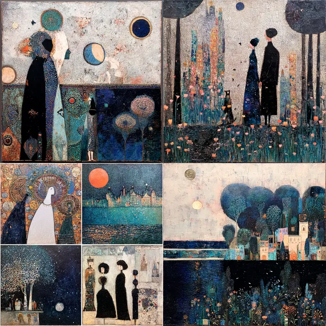 Этот стиль отличается насыщенной текстурой и замысловатыми деталями. Он напоминает о роскоши модерна и венского сецессиона, с оглядкой на декоративную элегантность орнаментов Густава Климта. Преобладание холодных оттенков синего и приглушённых тонов создаёт сказочную, эфемерную атмосферу.