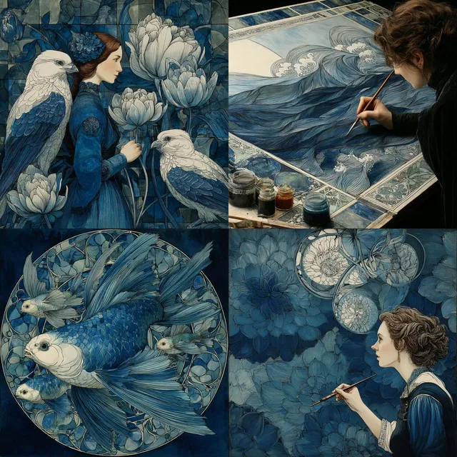Сложный рисунок линий и детальные композиции определяют этот стиль, который во многом вдохновлён ар-нуво и прерафаэлитами. Насыщенные текстуры и символичные образы создают сказочную, эфемерную атмосферу. Часто используется монохроматическая синяя палитра, которая усиливает мистическое восприятие.