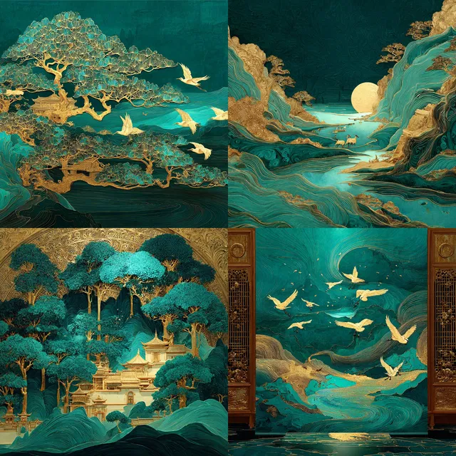 Этот стиль богато украшен замысловатыми линиями и роскошными деталями. Он излучает элегантность, напоминающую искусство модерн и восточные художественные традиции. Использование бирюзово-золотой палитры придаёт каждому изделию ощущение царственности и мистики, создавая нежную и чарующую атмосферу.