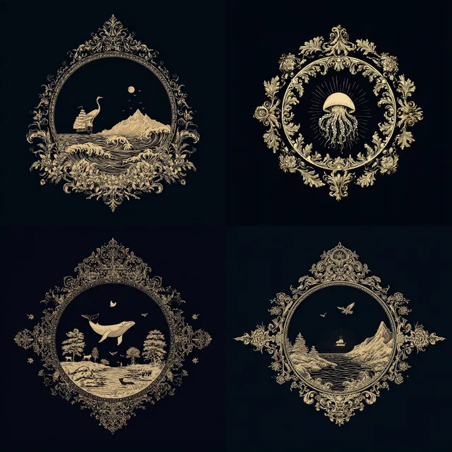 Изысканные детали и сложные линии преобладают, создавая визуальную композицию, которая перекликается с элегантностью ар-нуво и эстетикой викторианской эпохи. Симметричные композиции и декоративные мотивы усиливают ощущение неподвластной времени изысканности, а монохромная палитра с золотыми акцентами добавляет нотку роскоши.