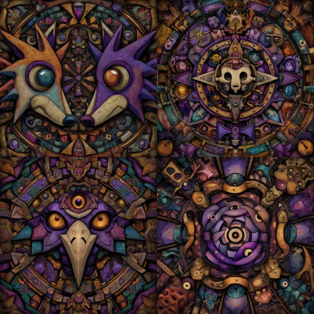Сложные композиции и многоуровневые дизайны создают текстурное богатство, напоминающее об искусстве ар-нуво и сюрреализме. Мифические элементы и культурный символизм придают работам сказочное качество, предлагая фантастический побег в потусторонние миры.