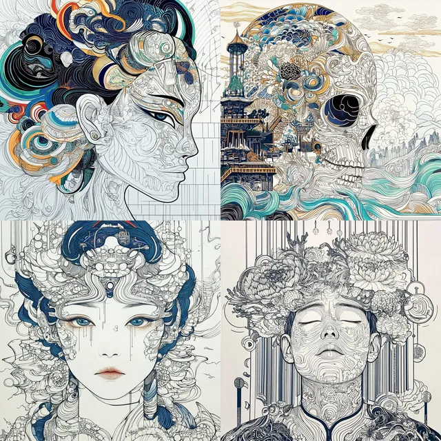 Сложный и изысканный линейный рисунок, детальная проработка элементов определяют этот стиль, создавая полотно из витиеватых узоров и богато украшенных мотивов. Композиции насыщены сложными структурами и воздушной элегантностью, напоминающей модерн и символизм. Приглушённые тона и мягкие цвета усиливают сказочность, а тщательная проработка свидетельствует о высоком уровне художественной точности.