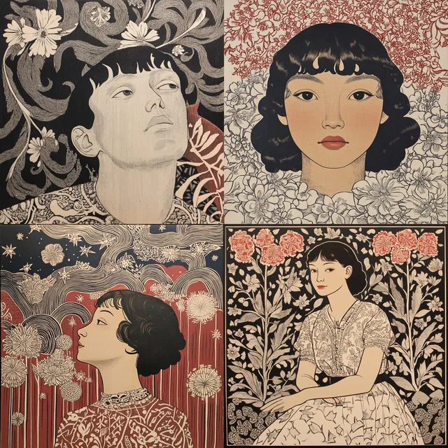 Этот стиль отличает богатое декоративное оформление и сложная прорисовка деталей, напоминающие течения ар-нуво и югендстиль. В основе декоративной эстетики лежат цветочные мотивы и ботанические темы, которые создают сказочную, эфемерную атмосферу. Монохромная палитра и ограниченное количество цветов подчёркивают нежные и элегантные композиции.