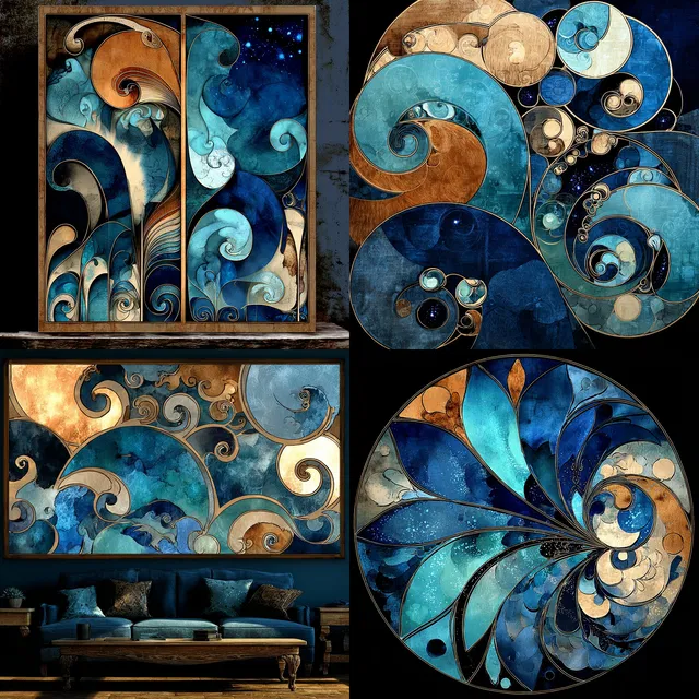 Визуально завораживающий стиль, отличающийся богато украшенными и декоративными элементами, напоминающий модерн и символизм. В цветовой палитре преобладают насыщенные синие и глубокие золотые тона, создающие светящуюся и эфемерную атмосферу. Стиль отличается криволинейными и замысловатыми узорами, часто включающими многослойные текстуры и детальные мотивы.