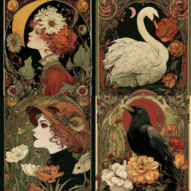 В оформлении преобладают витиеватые композиции с замысловатыми линиями и декоративными мотивами, напоминающими стиль модерн. Этот стиль отличается созданием сложных, украшенных визуалов с ностальгической атмосферой, в значительной степени основанных на исторических и культурных влияниях. Широко используются цветочные и ботанические элементы, которые подчёркивают природные темы и органические формы.
