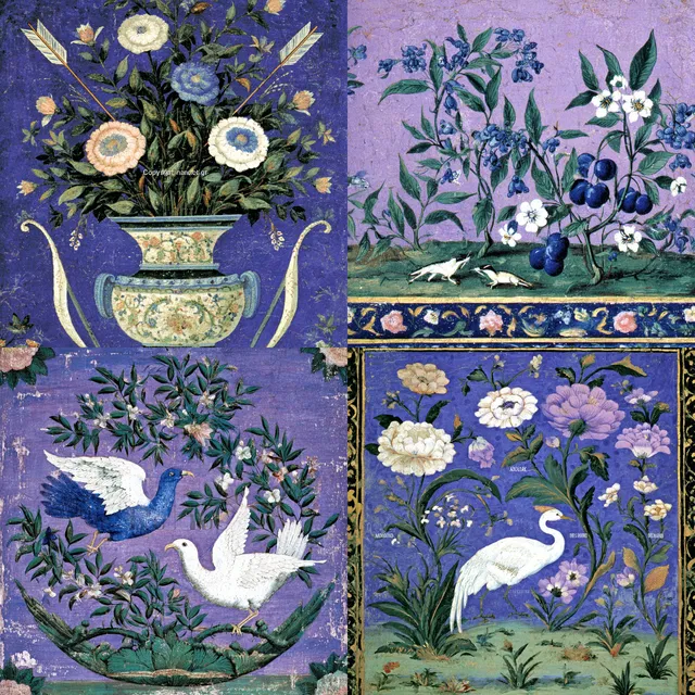 Этот стиль — яркое воплощение мастерства персидских и могольских художников. Он отличается сложной детализацией и декоративной красотой. В цветовой палитре преобладают насыщенные оттенки синего и фиолетового, что создаёт атмосферу роскоши и богатства.