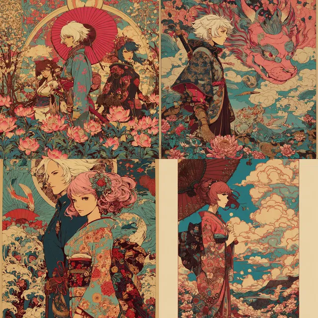 Этот стиль отличается яркостью и сложностью. Он объединяет элегантность модерна с влиянием японской гравюры укиё-э, создавая насыщенную палитру для визуального повествования. Использование смелых, гармоничных цветов и детальной прорисовки линий приводит к созданию изысканных и динамичных композиций. Персонажи выразительны, они часто помещены на фоне фантастических пейзажей, наполненных культурными мотивами и мифическими элементами.