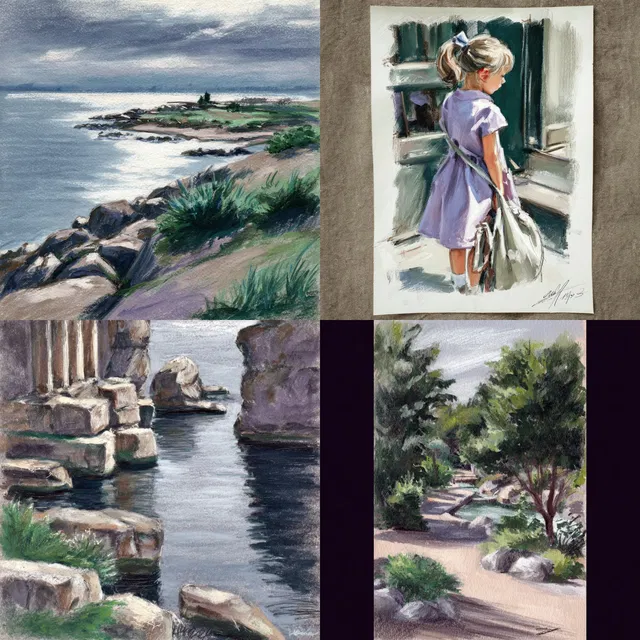 Живописные текстуры и выразительные мазки определяют этот стиль, вызывая чувство ностальгии и простоты. Использование приглушённых пастельных и мягких оттенков создаёт безмятежную атмосферу, а сложные детали и замысловатые узоры демонстрируют техническое мастерство.