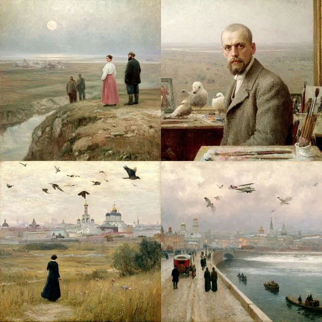 Живописный реализм передаёт суть русских пейзажей и культурных сюжетов XIX века, сочетая атмосферную перспективу с эмоциональным резонансом. Мягкое освещение и приглушённые цвета создают меланхоличную безмятежность, а детальная проработка и реалистичная отрисовка подчёркивают историческую достоверность.