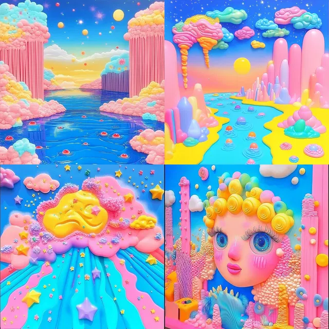 Этот стиль характеризуется буйством пастельных красок и игривых форм, создавая причудливую и сказочную визуальную атмосферу. Использование округлых форм и глянцевых текстур придаёт композициям детскую непосредственность, напоминая поп-арт и современную эстетику.
