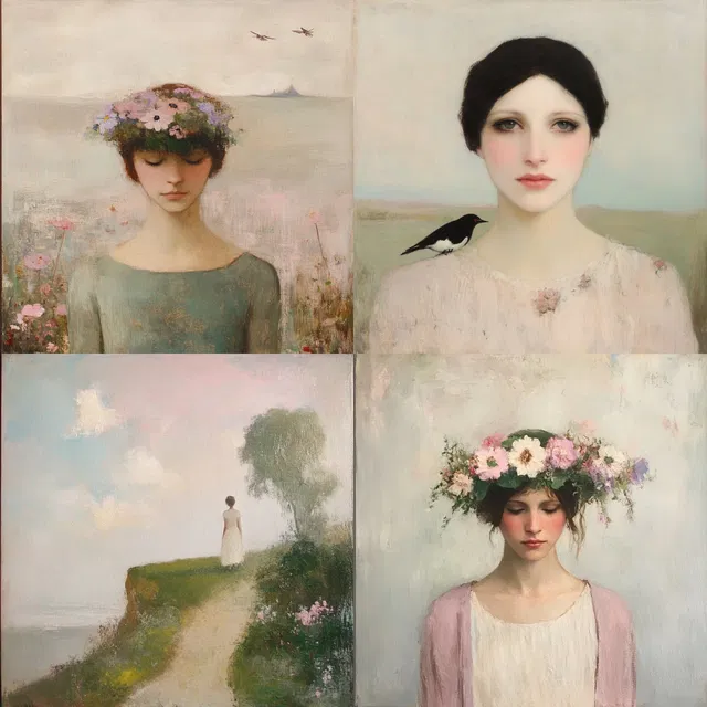 Этот стиль определяют эфемерная красота и сказочность. Для него характерны пастельные тона и мягкие градиенты. Преобладают романтические и пасторальные темы. Нежные мазки кисти и тонкие оттенки создают ностальгическую атмосферу. Сюрреалистичные и причудливые элементы придают особый шарм, а приглушённые цвета и мягкие текстуры усиливают безмятежность.