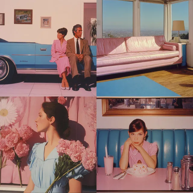 Преобладают яркие пастельные оттенки, которые создают ностальгическую, но футуристическую атмосферу. Чистые линии и гиперреалистичные детали отражают влияние поп-арта и середины XX века, придавая различным темам сказочное качество.