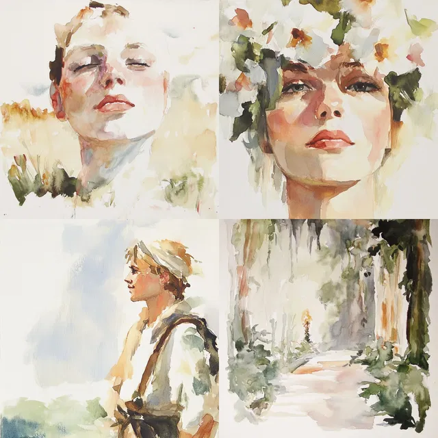 Воздушная акварельная элегантность передаёт суть текучести и спокойствия благодаря мастерскому использованию техник акварели. Этот стиль отличается созданием мягких, словно из сна, атмосфер с помощью пастельных тонов и плавных переходов, вызывая чувство безмятежности и умиротворения.