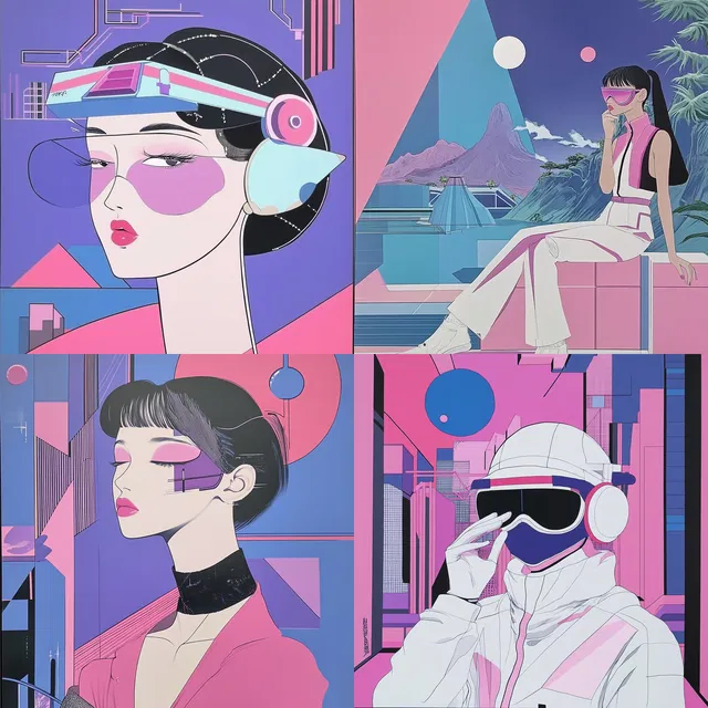 Этот стиль определяют яркие пастельные тона и изящные геометрические формы, которые объединяют эстетику ретрофутуризма с современным минимализмом. Постоянное использование мягких градиентов и чётких линий создаёт эфемерную элегантность, которая проявляется в самых разных темах: от футуристических городских пейзажей до стилизованных портретов.