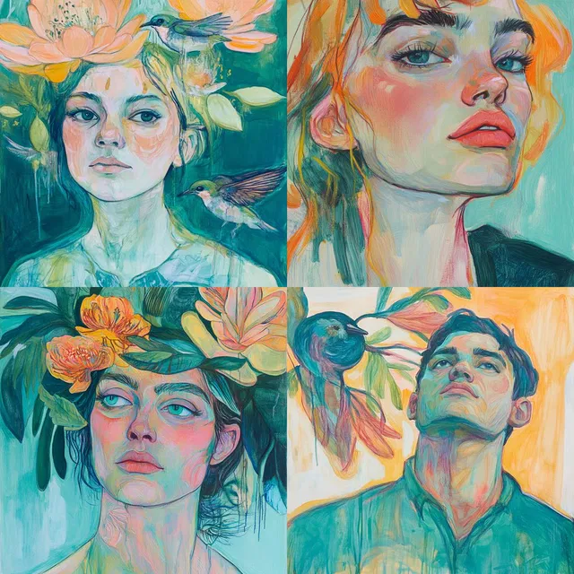 В этих примерах в стиле Midjourney преобладает живописный подход. Они демонстрируют выразительную манеру письма кистью и яркую пастельную палитру. Композиции насыщены иллюстративными качествами, в них органично сочетаются абстрактные и органические формы.