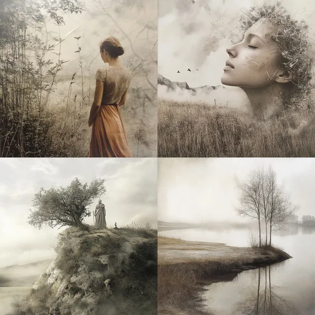Эфирные тона и туманная атмосфера определяют этот стиль, создавая ощущение чего-то сказочного в разных темах. Мягкие градиенты и плавные переходы придают лёгкость, а приглушённые тона усиливают безмятежное настроение.