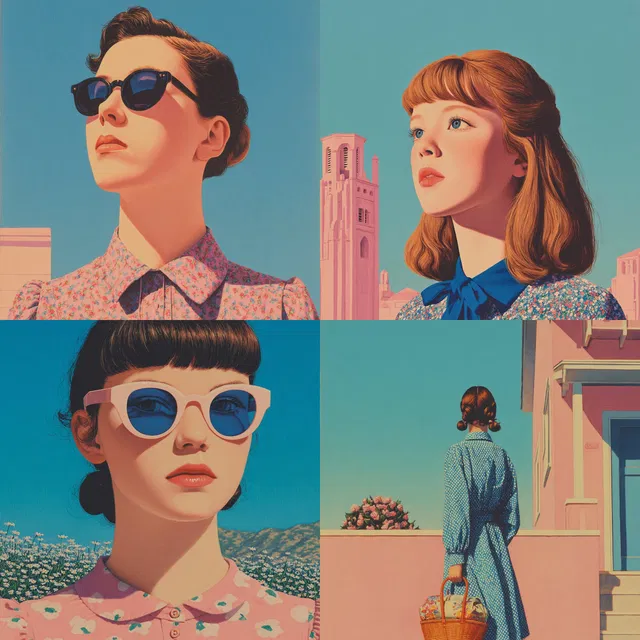 Яркие пастельные тона и стилизованный реализм определяют этот визуальный стиль, передавая ностальгическую, но в то же время сюрреалистичную атмосферу. Использование плоских цветовых полей и чётких контуров создаёт чистую графическую эстетику, напоминающую модернизм середины XX века.