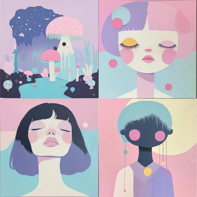 Преобладают пастельные тона и причудливые элементы, которые создают сказочную, игривую атмосферу в различных темах. В этом стиле используются мягкие оттенки и упрощённые формы, что придаёт каждому изображению нежность и сюрреалистичность.