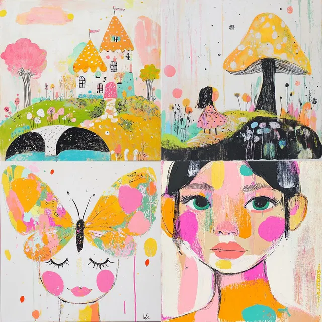 «Whimsical Pastel Play» очаровывает своей яркой палитрой и игривыми мазками кисти, создавая радостное и динамичное визуальное впечатление. Использование пастельных оттенков и живых композиций в этом стиле пробуждает чувство детского удивления и фантазии, что делает его идеальным для создания причудливых произведений искусства в жанре фэнтези.