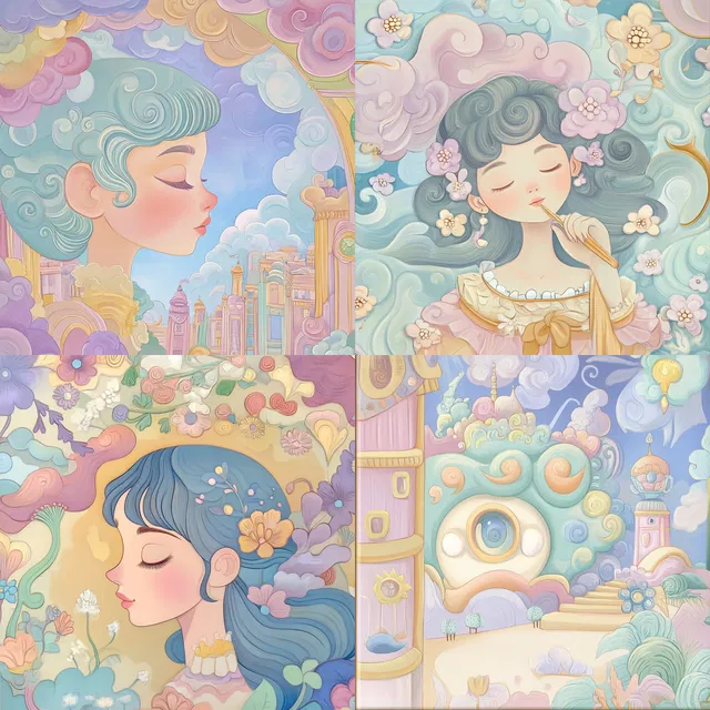 Преобладают пастельные пейзажи снов с их мягкой фантазией и нежным сюрреализмом, которые создают утончённую причудливость. Причудливая манера письма и игривые мазки кисти вызывают атмосферу сновидений, а закрученные формы и плавные очертания определяют замысловатые узоры. Этот стиль прекрасно подходит для создания неземной атмосферы и фантастических декораций, что делает его идеальным для детских книг и фэнтези-арта. Однако отсутствие фотореализма может ограничить его применение в более реалистичных контекстах.