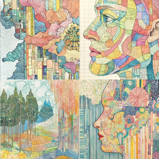 В этом стиле преобладают сложные линии и детальные текстуры, создающие лоскутную эстетику, напоминающую стёганые изделия. Стиль отличается многослойными композициями и наложением форм, плавно сочетая органические и геометрические элементы. Пастельные тона и мягкие оттенки усиливают причудливую и игривую атмосферу, а влияние стиля модерн проявляется в декоративных мотивах.