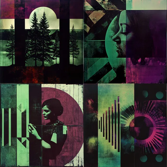 Геометрическая абстракция преобладает благодаря многослойным текстурам и симметричным композициям, создавая эстетику в стиле ретрофутуризм. Приглушённая зелено-фиолетовая палитра добавляет сдержанный, но яркий контраст. Заметно влияние стилей Баухаус и Арт-деко. Силуэтные фигуры и городские пейзажи усиливают модернистскую тему, хотя в некоторых контекстах стилю может не хватать фотореализма.