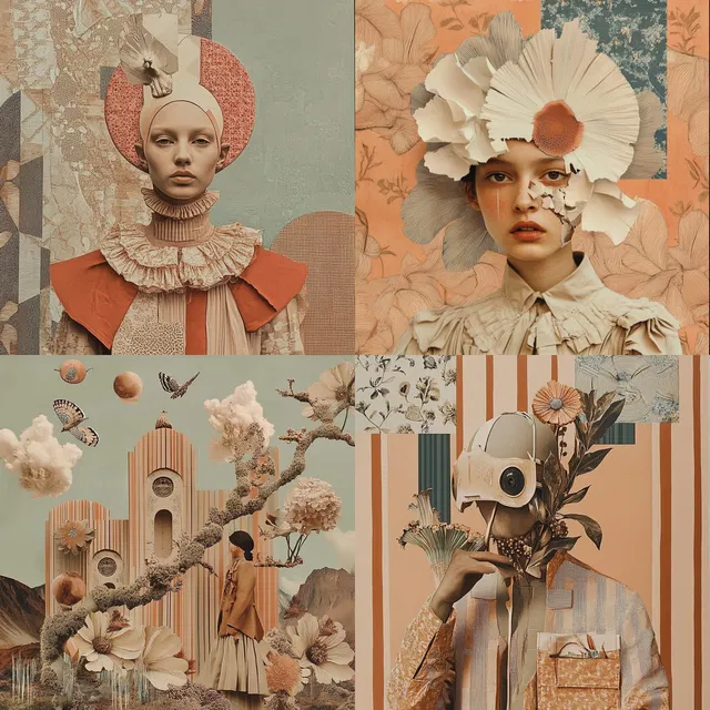 Преобладают приглушённые тона и землистые оттенки, которые создают ностальгическую и сказочную атмосферу. Стиль отличается мастерством в области сюрреализма и коллажа, с многослойными композициями и глубиной текстуры. Заметны причудливые персонажи и исторические влияния, создающие уникальное сочетание ретрофутуризма и модерна.