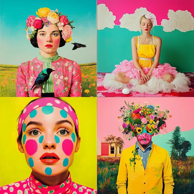 Доминируют яркие цвета и игривые композиции, которые создают причудливую и сюрреалистичную атмосферу. Смелые и дерзкие дизайны пронизаны влиянием поп-арта и сюрреализма, что придаёт визуалам динамику и энергичность. Этот стиль прекрасно подходит для творческих решений в самых разных областях — от моды до редакционной иллюстрации. Однако в более тонких контекстах ему может не хватать утончённости и глубины, поскольку он предпочитает смелые выражения сложным деталям.