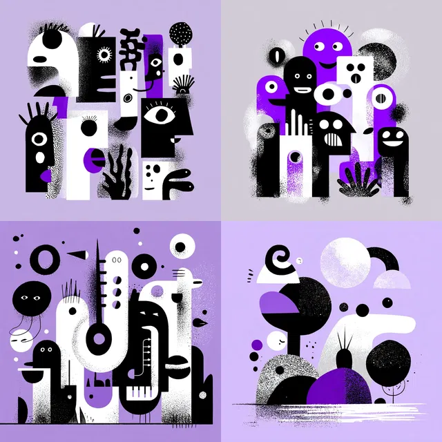 Этот стиль отличает смелый графический минимализм с абстрактными формами и упрощённой геометрией. Монохромная палитра с фиолетовыми акцентами создаёт яркие контрасты. Лёгкая абстракция и влияние кубизма наполняют атмосферу причудливостью.