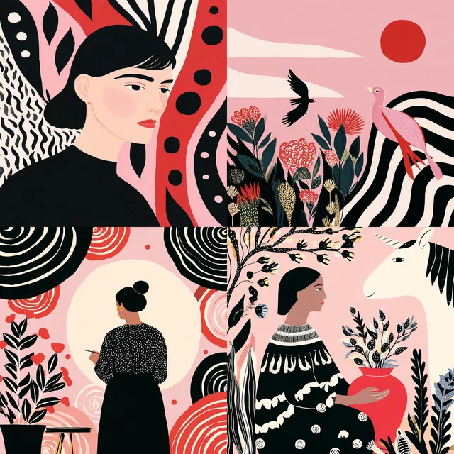 Яркий и игривый стиль характеризуется использованием плоских цветов и смелых контуров, что вызывает ощущение причудливости и радости. В композициях преобладают упрощённые формы и графические элементы, вдохновлённые поп-артом и минимализмом. Ограниченная цветовая палитра, часто монохромная с яркими красными акцентами, усиливает визуальное воздействие.