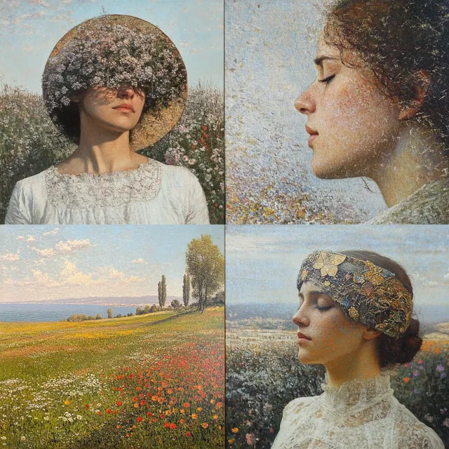 В основе лежит богатый текстурами реализм, а пуантилистский подход создаёт сложные многослойные композиции. Стиль отлично передаёт пасторальное спокойствие и неземное умиротворение, часто вызывая чувство ностальгии и отсылки к истории. Преобладают текстурированные поверхности и землистые тона, которые придают теплоту и естественность.