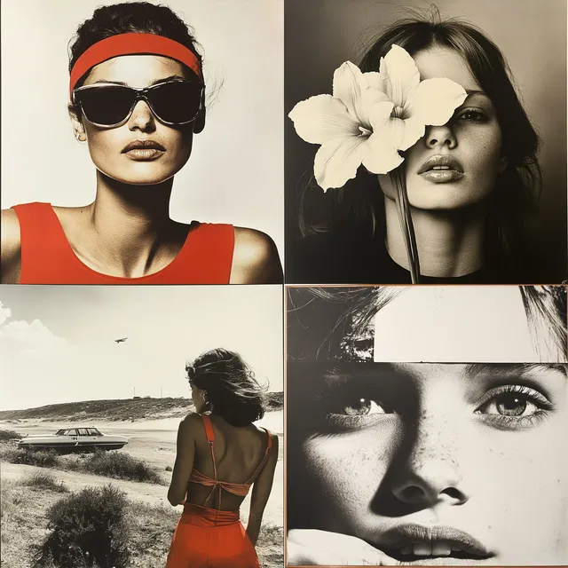 Доминирует монохромная элегантность с ярким использованием чёрно-белой утончённости в разных темах. Постоянно присутствует текстурная глубина и многослойность, создающие драматическое и театральное освещение. Стиль отличается графической чёткостью и визуальной резкостью, что делает его идеальным для редакционного дизайна и модной фотосъёмки.