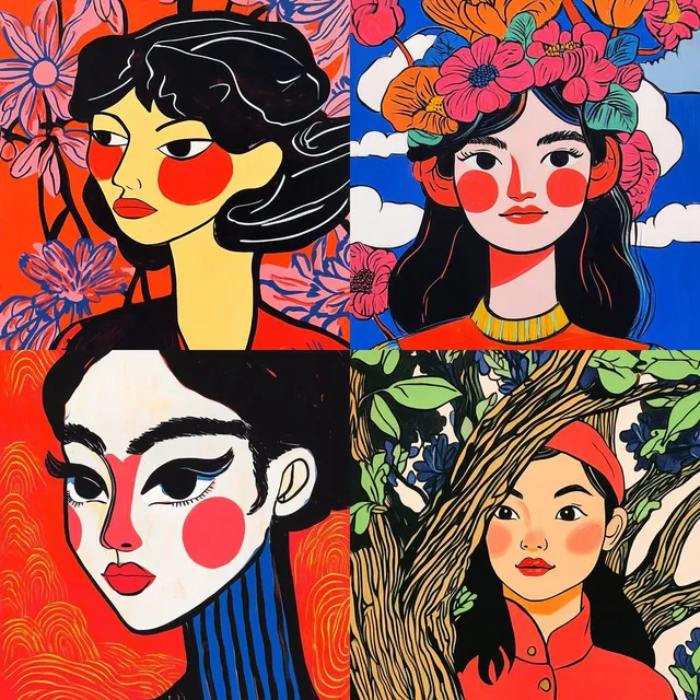 Преобладают упрощённые формы и стилизованные мотивы, которые придают изображениям современную и абстрактную эстетику, напоминающую поп-арт и экспрессионизм. Этот подход хорошо подходит для тем, исследующих культурную идентичность и городскую жизнь, но ему может не хватать тонкости, необходимой для более тонких или реалистичных изображений.