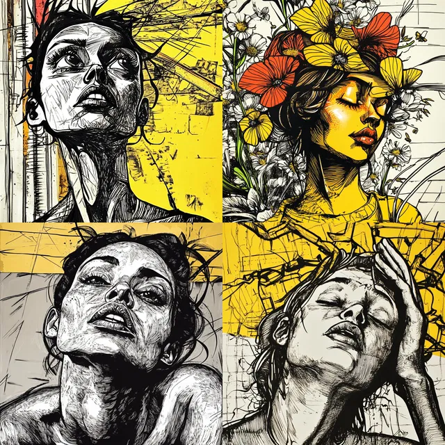 Доминирует яркий жёлтый цвет, создающий смелый и динамичный визуальный язык, напоминающий поп-арт и эстетику комиксов. В этом стиле используются выразительные лица и замысловатые детали, с особым акцентом на смелых контурах и текстурированных поверхностях. Динамичные композиции и графическое воздействие последовательно проявляются в разных образцах, демонстрируя уникальное сочетание ретрофутуризма и урбанистической эстетики.